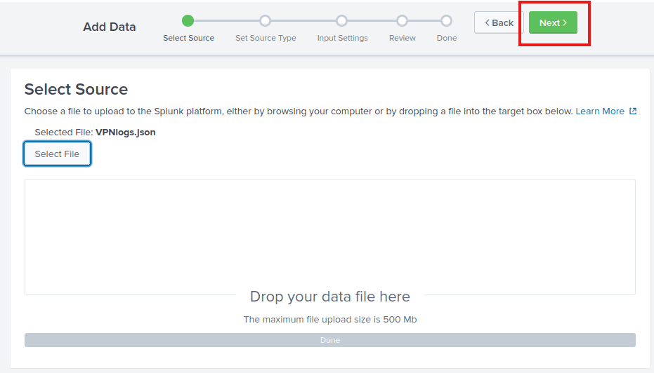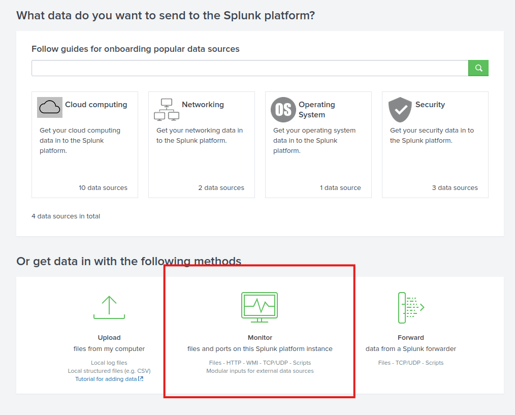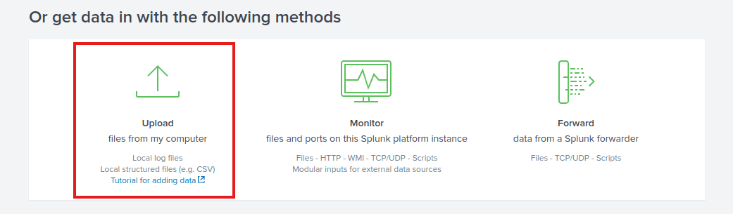 In this task, we’re going to focus on VPN logs. We’re presented with the following screen when we click on the Add Data link on the Splunk home screen.