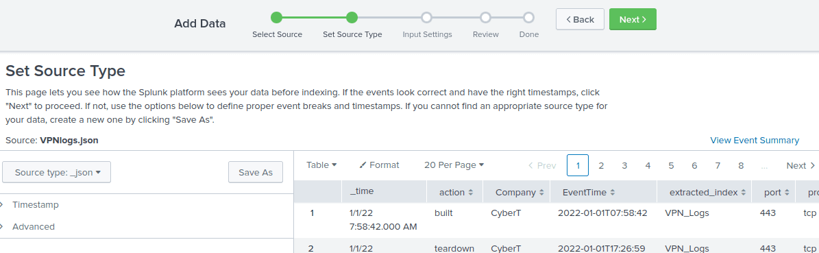 Now you have to select the source type, which is JSON. Press next again.