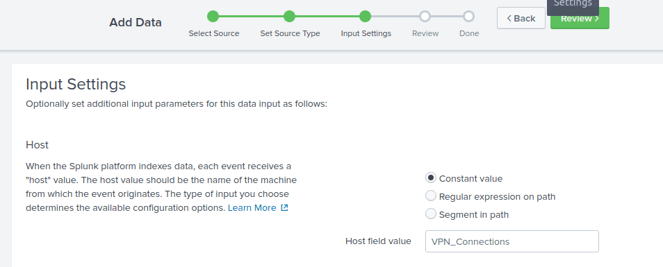 Now, create a new index called VPN_Logs. Press next, check everything and press Submit. Finally, press Start Searching.