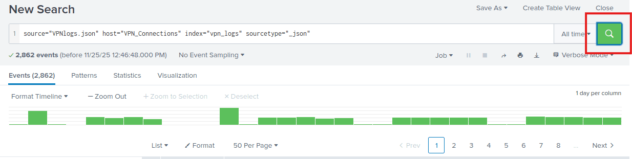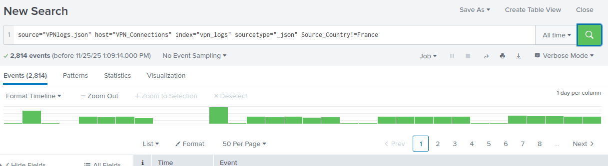source=”VPNlogs.json” host=”VPN_Connections” index=”vpn_logs” sourcetype=”_json” Source_Country!=France