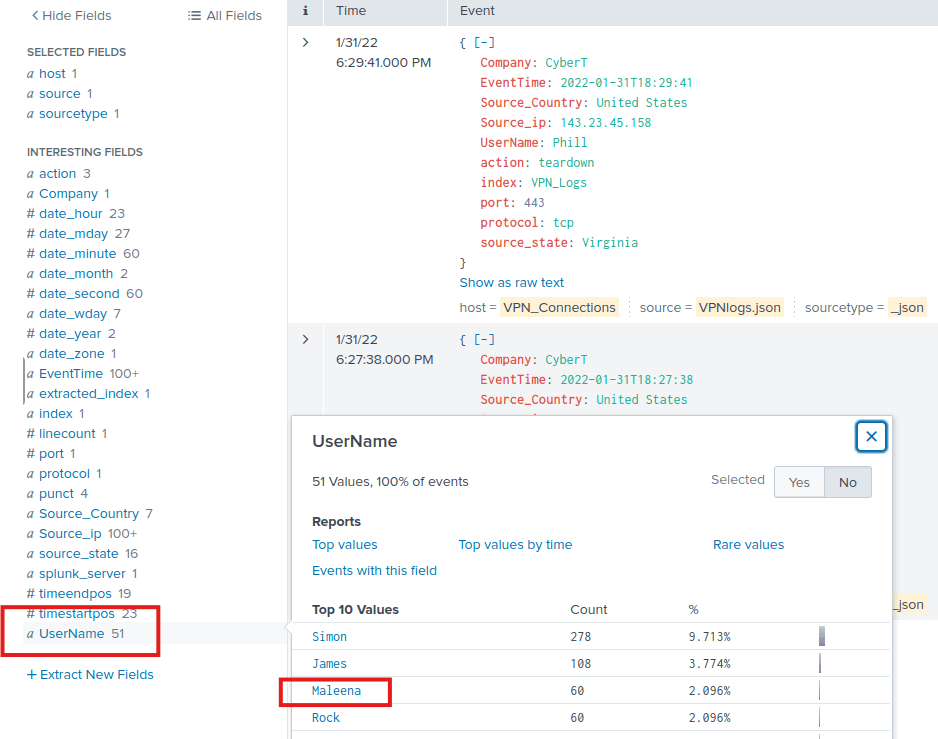 source=”VPNlogs.json” host=”VPN_Connections” index=”vpn_logs” sourcetype=”_json” UserName=Maleena