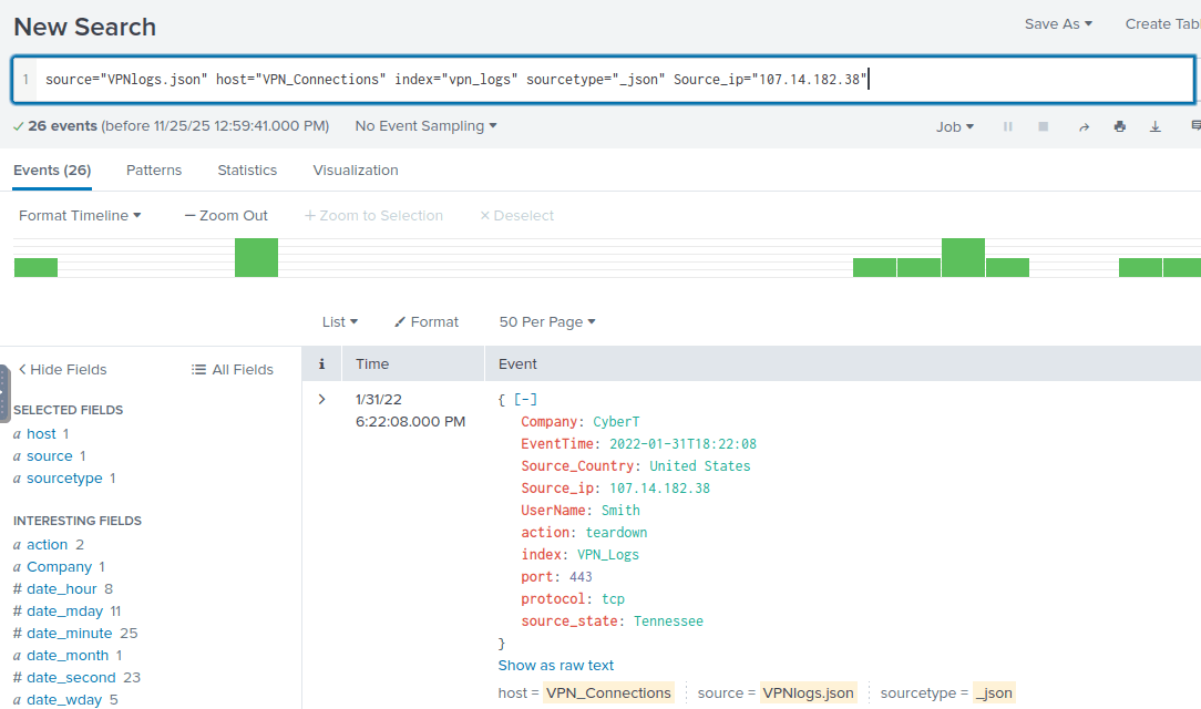 source=”VPNlogs.json” host=”VPN_Connections” index=”vpn_logs” sourcetype=”_json” Source_ip=”107.14.182.38″